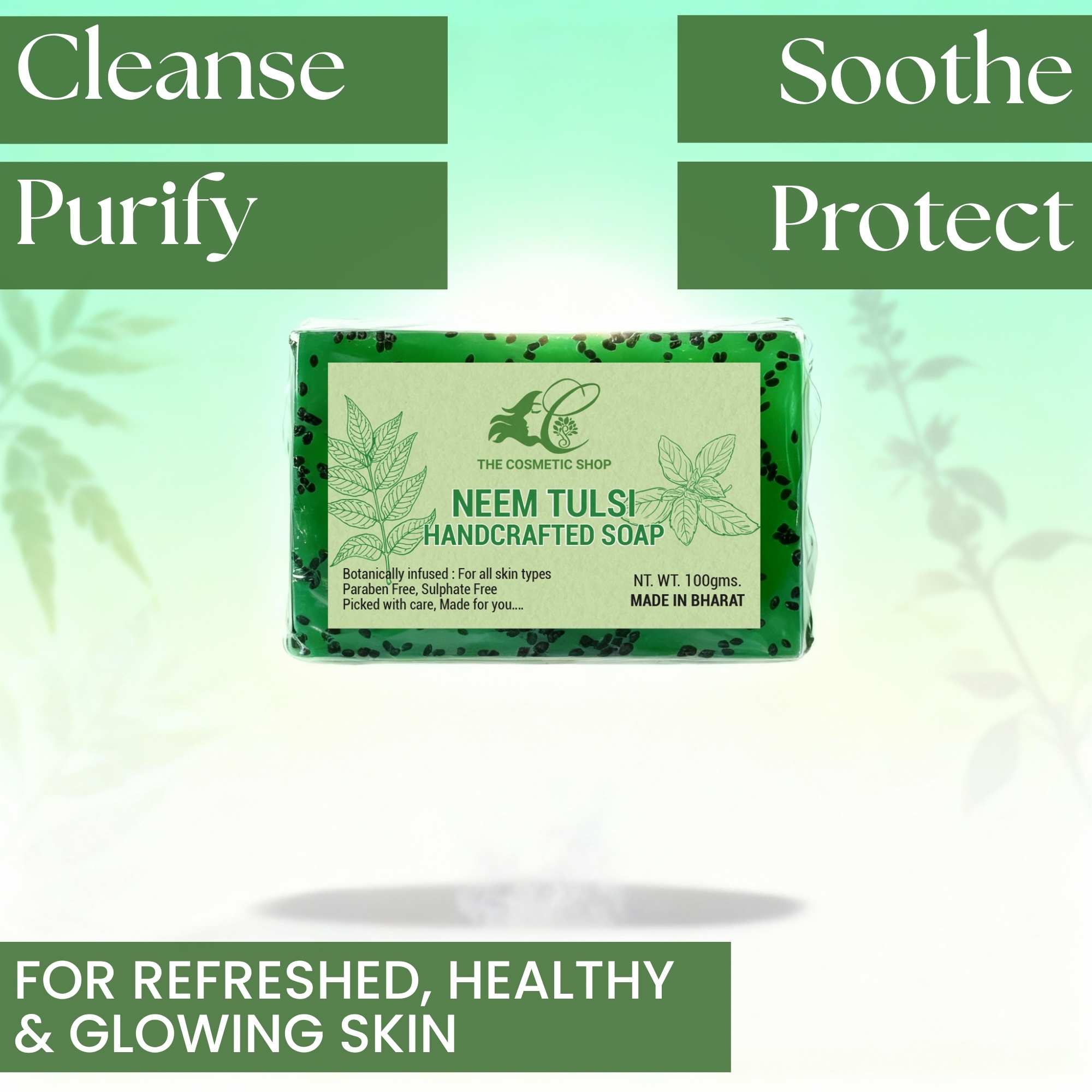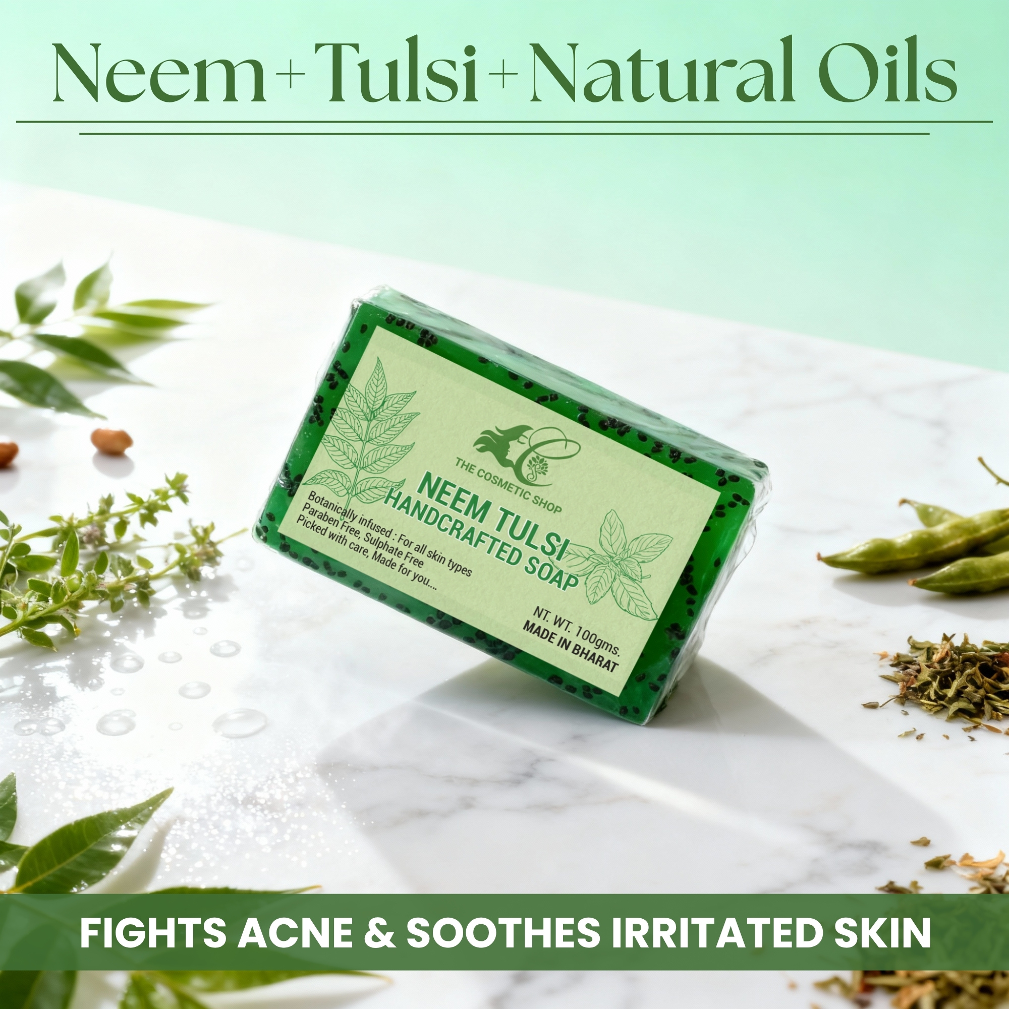The Ultimate Ayurvedic Shield for Clear, Healthy Skin. Discover the deep-cleansing power of The Cosmetic Shop’s Neem Tulsi Soap. Handcrafted with love, this bar combines two of nature’s most potent healers to detoxify your pores and renew damaged skin cells. Whether you are dealing with stubborn pimples or simply want a daily protective barrier against environmental toxins, our sulphate-free formula keeps your skin supple and radiant.